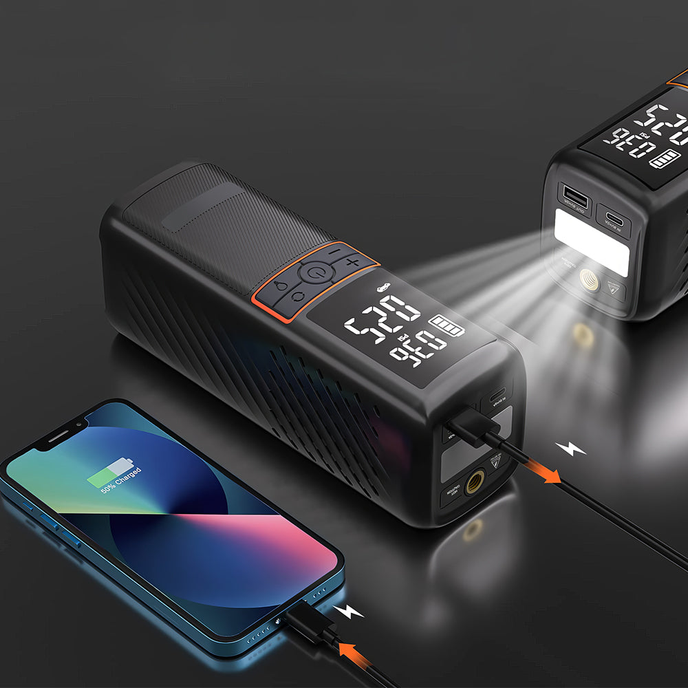 Experience powerful and convenient inflation with this portable air compressor. Featuring a maximum pressure of 160 PSI and fast 35L/min airflow, it can inflate a standard car tire in just one minute. The built-in 7500mAh rechargeable battery provides up to 45 minutes of wireless use and doubles as a power bank. Equipped with smart preset modes, a large LED screen, and automatic shut-off, this inflator is perfect for cars, motorcycles, bicycles, and sports balls. Designed for both daily use and emergency roadside needs, it’s compact, cordless, and travel-ready.